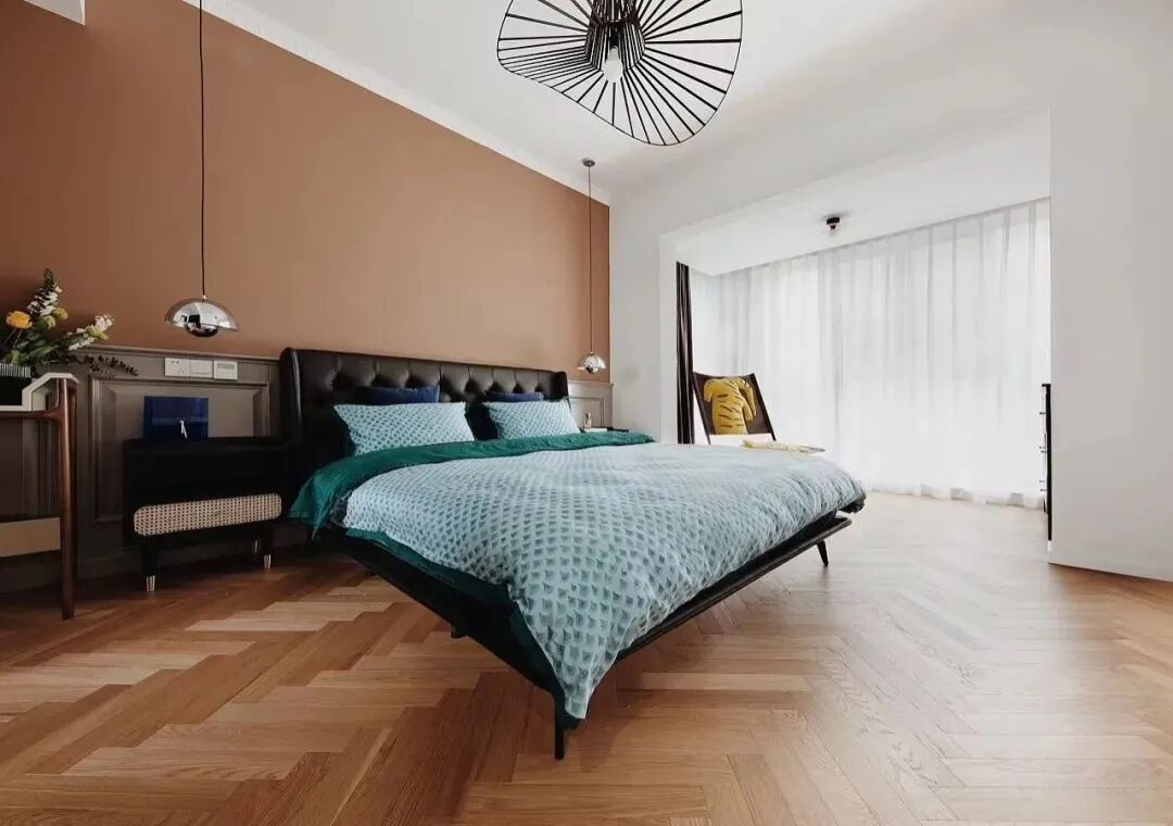 温暖的棕色从墙面绵延到地面,丝绒蓝作为点缀,提高整体亮度,一冷一热的两个色系,色彩情感更丰富,突出空间时尚感,在柔和的光照下,强烈的色彩对比是家中吸睛亮点。